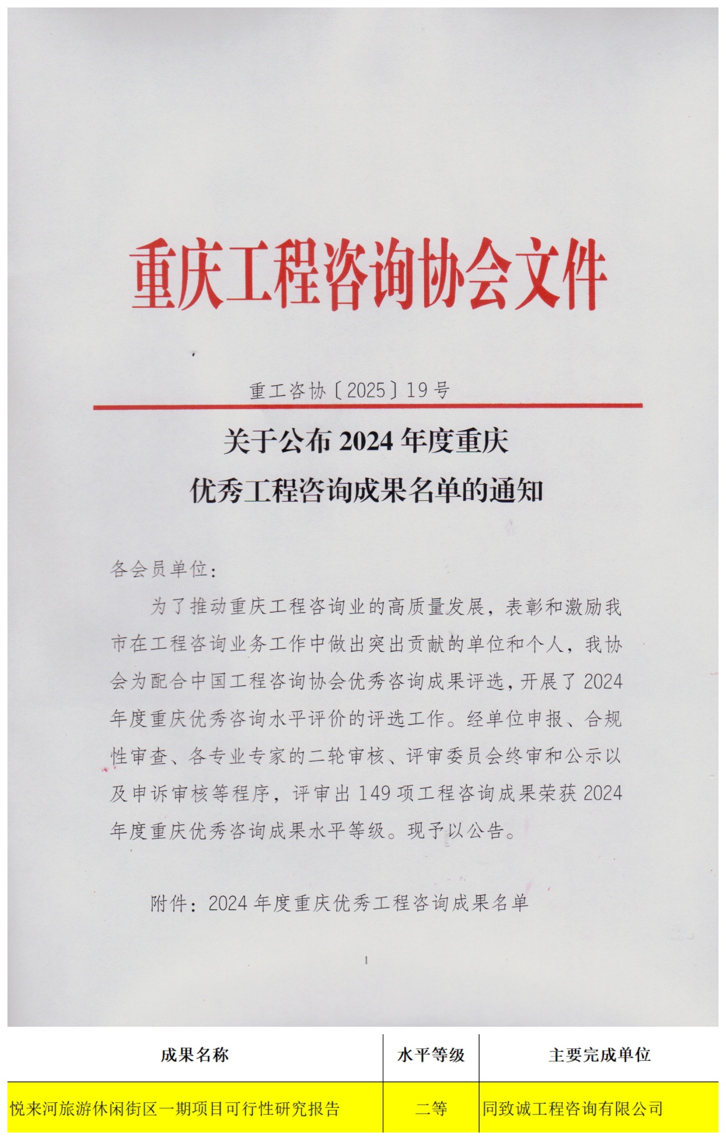 近日,重慶工程咨詢協(xié)會正式公布了2024年度重慶優(yōu)秀工程咨詢成果名單,由我司編制的《悅來河旅游休閑街區(qū)一期項目可行性研究報告》憑借專業(yè)的分析、創(chuàng)新的理念和高質量的成果,成功獲評2024年度重慶優(yōu)秀工程咨詢成果二等獎!