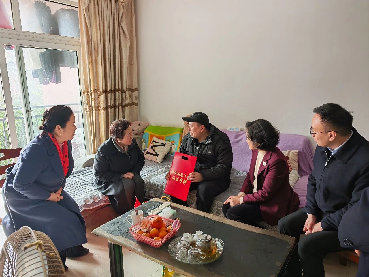 歲末年初,寒意漸濃,但關懷與溫暖從未缺席。為切實把黨委、政府的關懷和工會組織的溫暖送到職工心坎上,近日,市人大常委會副主任、黨組成員,市總工會主席陳元春帶隊赴兩江新區開展2026年元旦春節送溫暖慰問活動,并走訪慰問了我司困難職工劉勇。兩江新區工會主席郭麗娟、星系列樓宇工會聯合會主席邱莎、同致誠公司工會主席楊渝疆陪同慰問。