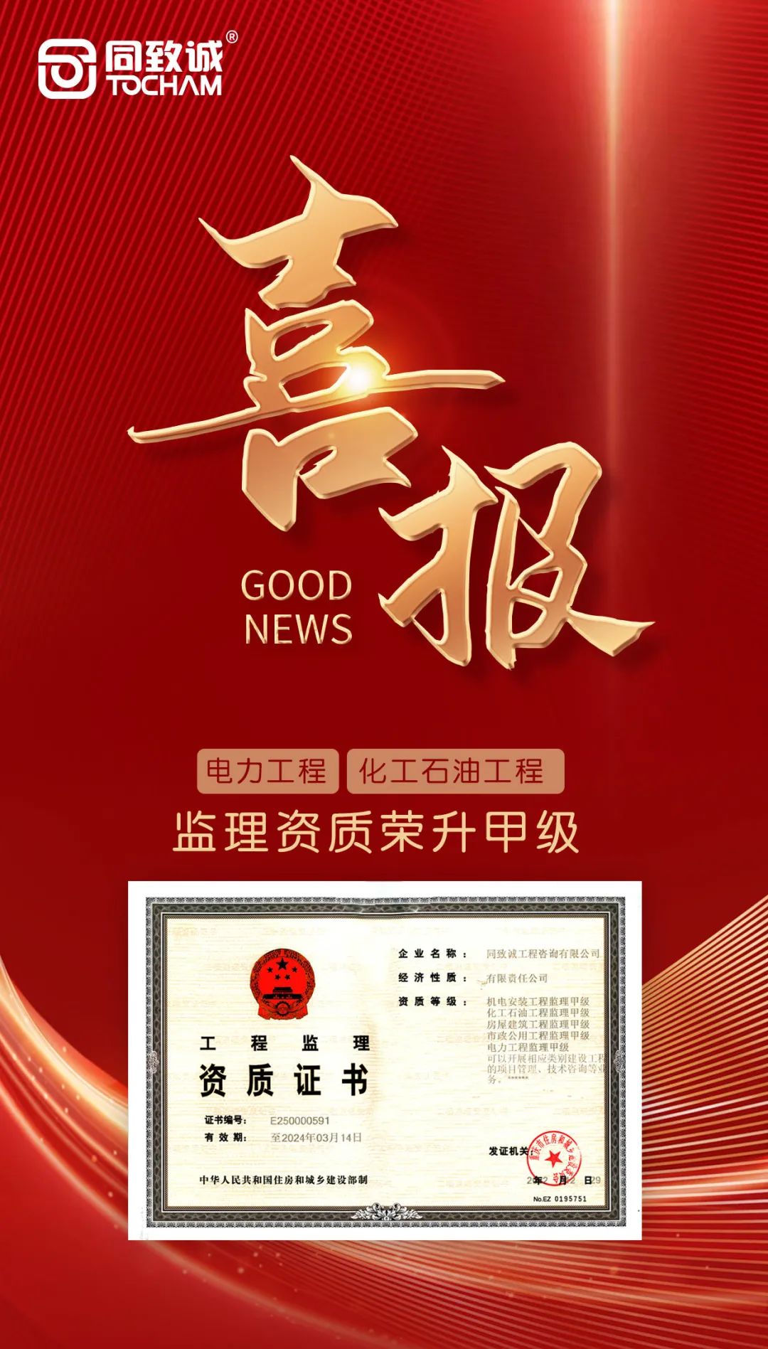 喜報 | 同致誠工程咨詢有限公司電力工程、化工石油工程監理資質榮升甲級