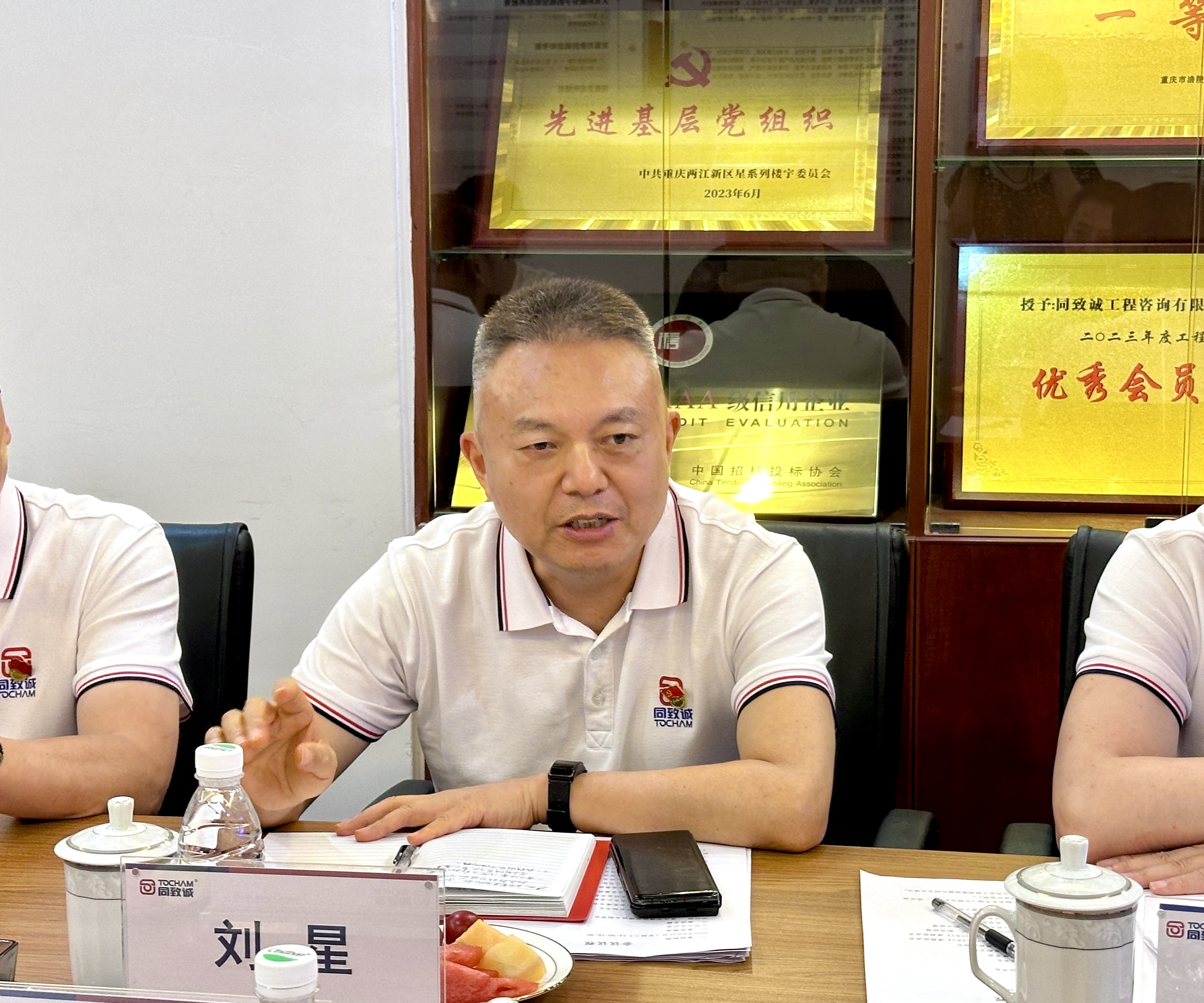 隨后,重慶市建設監理協會黨建專員周惕發表講話。他談到,此次調研慕名而來,同致誠公司的黨建工作給他留下了深刻印象——不僅真抓實干、成績斐然,更通過“黨建+業務”的創新融合,積累了可借鑒的特色經驗,值得在全行業推廣學習。同時,周老師針對民營企業的黨建工作開展提出了三點建議:一是抓好支部戰斗堡壘作用;二是發揮黨小組作用;三是加強流動黨員動態管理。