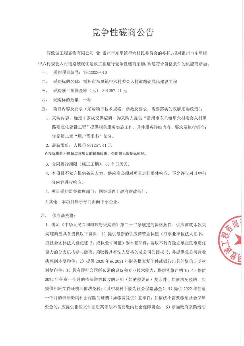 雷州市東里鎮甲六村委會入村道路硬底化建設工程