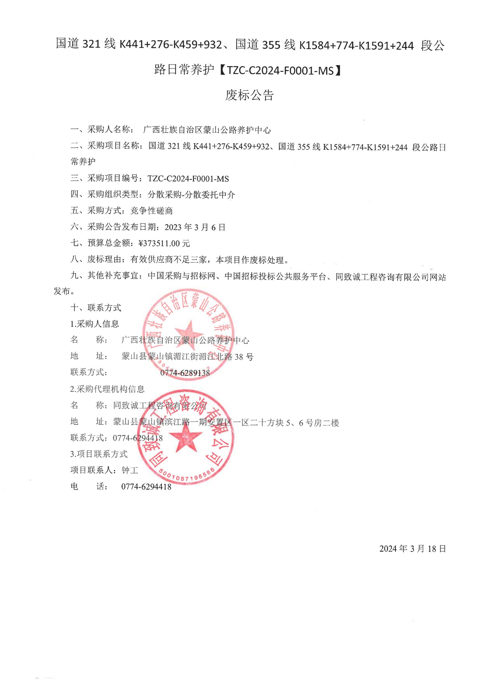 國道321線K441+276-K459+932、國道355線K1584+774-K1591+244 段公路日常養(yǎng)護(hù)廢標(biāo)公告