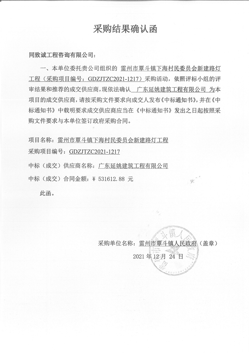 雷州市覃斗鎮(zhèn)下海村民委員會新建路燈工程 采購確認(rèn)函