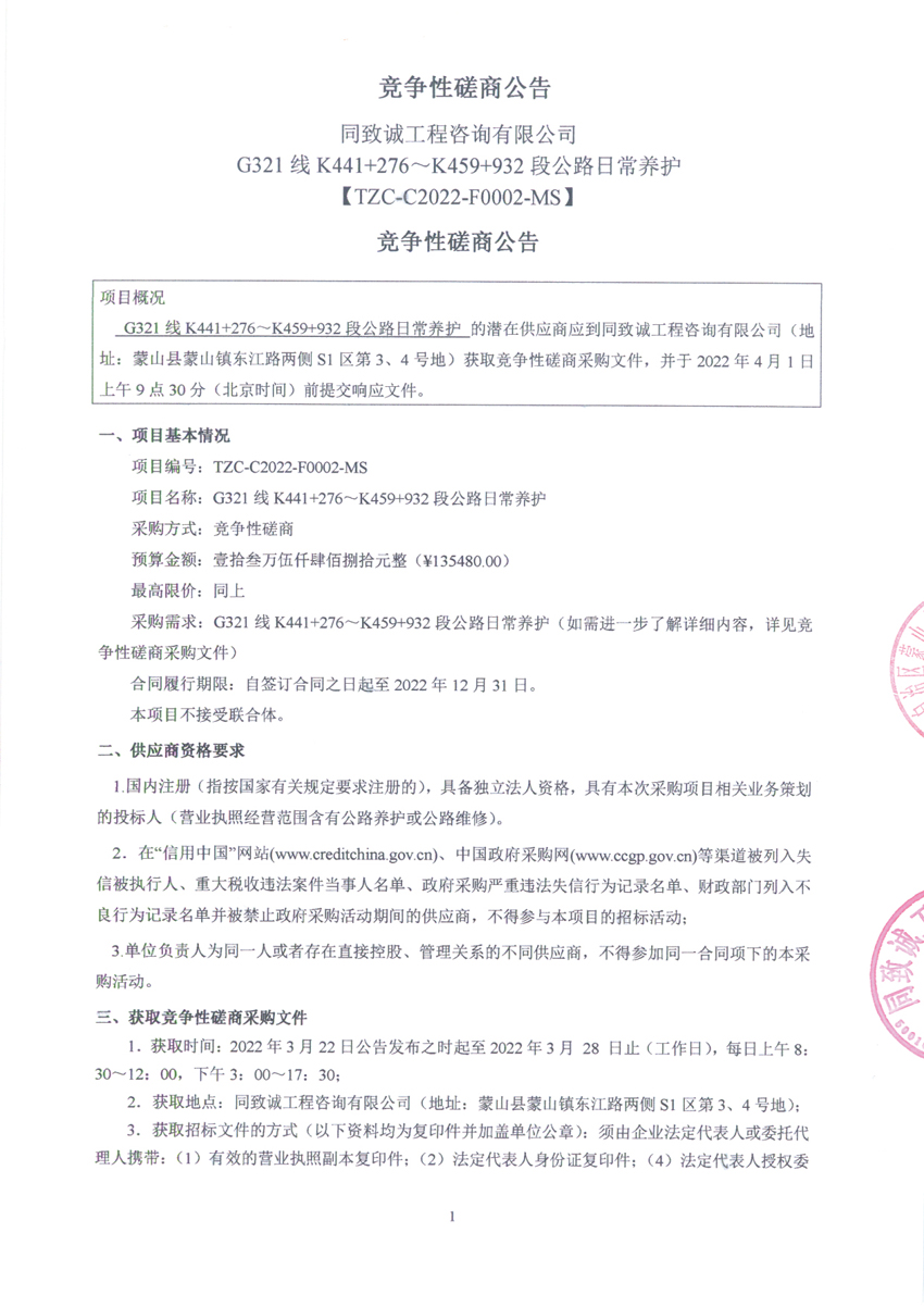 G321線K441+276~K459+932段公路日常養(yǎng)護(hù)磋商公告