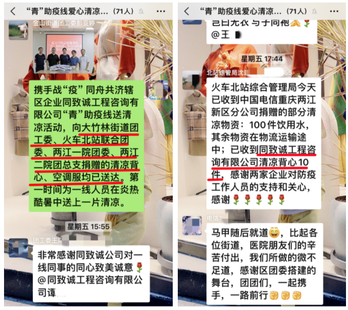 高溫送清涼,同心戰疫情。同致誠總部積極響應兩江新區團工委組織發起的“‘青’助疫線·送愛心送清涼”活動,做好一線工作人員后勤服務保障及防暑工作,分別向重慶兩江新區大竹林街道團工委、火車北站地區聯合團委、重慶兩江新區第一人民醫院團委、重慶兩江新區第二人民醫院團總支捐贈核酸采集降溫冰馬甲及核酸采集帶充電帶風扇馬甲,總價值5407元。